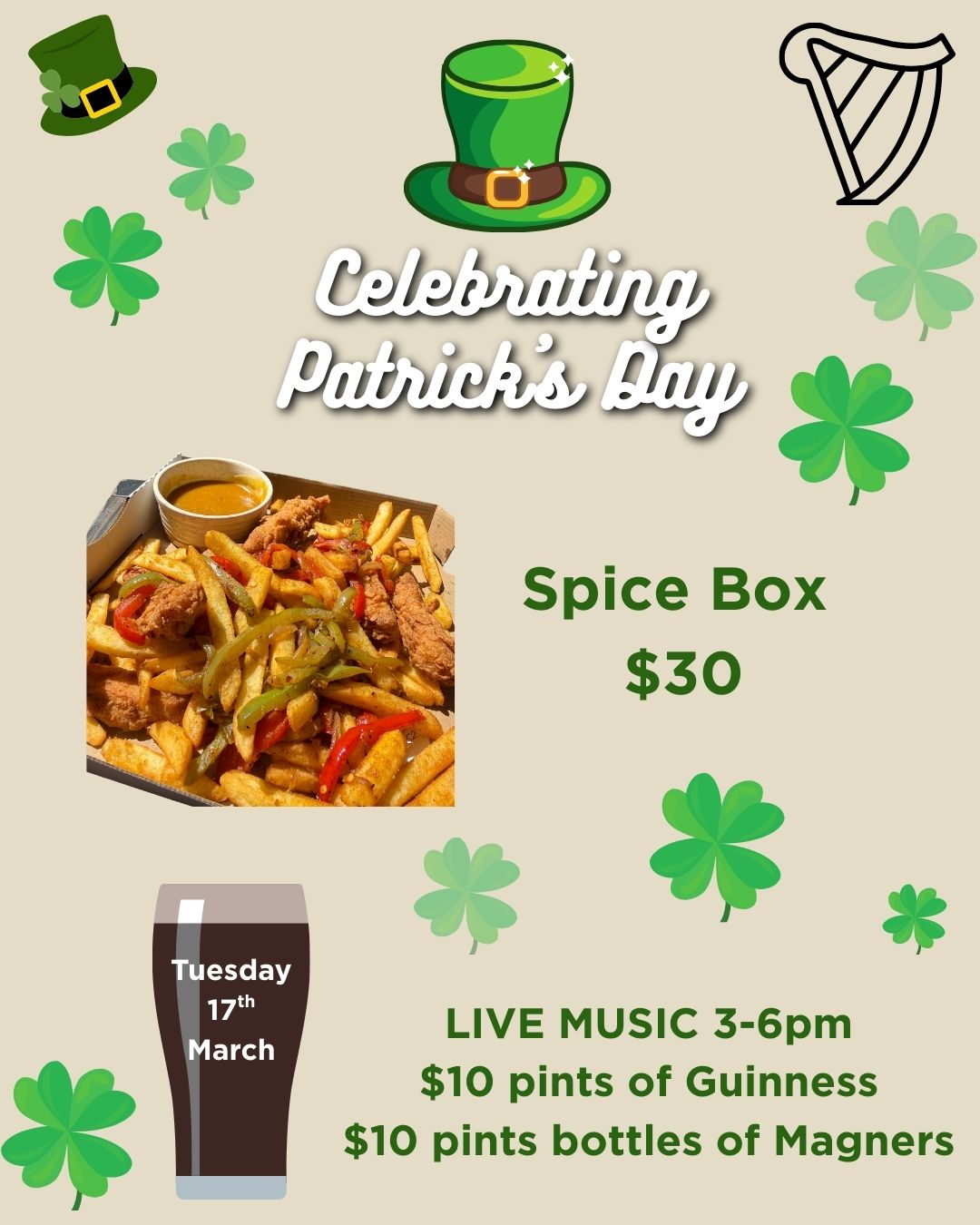 We’re bringing the Irish vibes with:🎶 Live Music 3–6pm🍺 $10 Pints of Guinness🍏 $10 Bottles of Magners🌶 Spice Box Special – $30 Grab your mates, wear something green, and join us Tuesday 17th March for a great afternoon of food, drinks and live music! 🍀